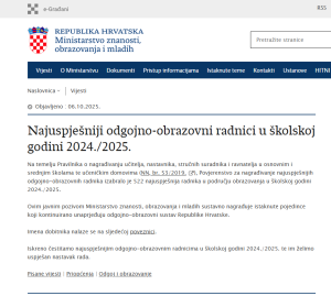 Povodom Svjetskog dana učitelja Ministarstvo znanosti, obrazovanja i mladih i ove jegodine tradicionalno nagradilo istaknute ...